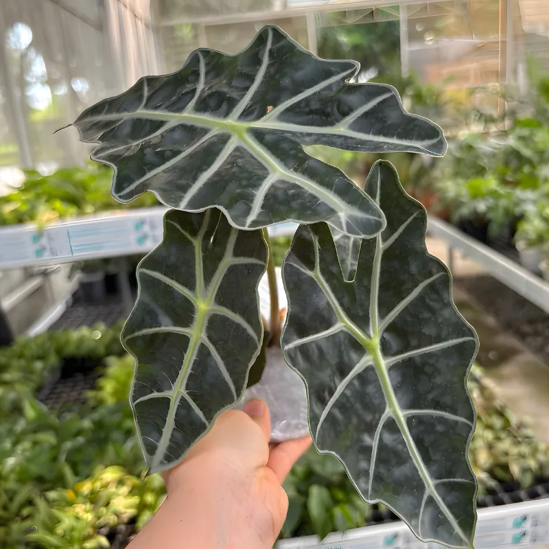 Chiều cao trung bình 40–60 cm, kích thước cây Alocasia Polly cân đối, lá dày, gân trắng bạc nổi rõ. Đây là nhóm phổ biến nhất của Alocasia Polly Cấy Mô, vừa đẹp vừa ổn định form. - Polly bụi lớn / Specimen