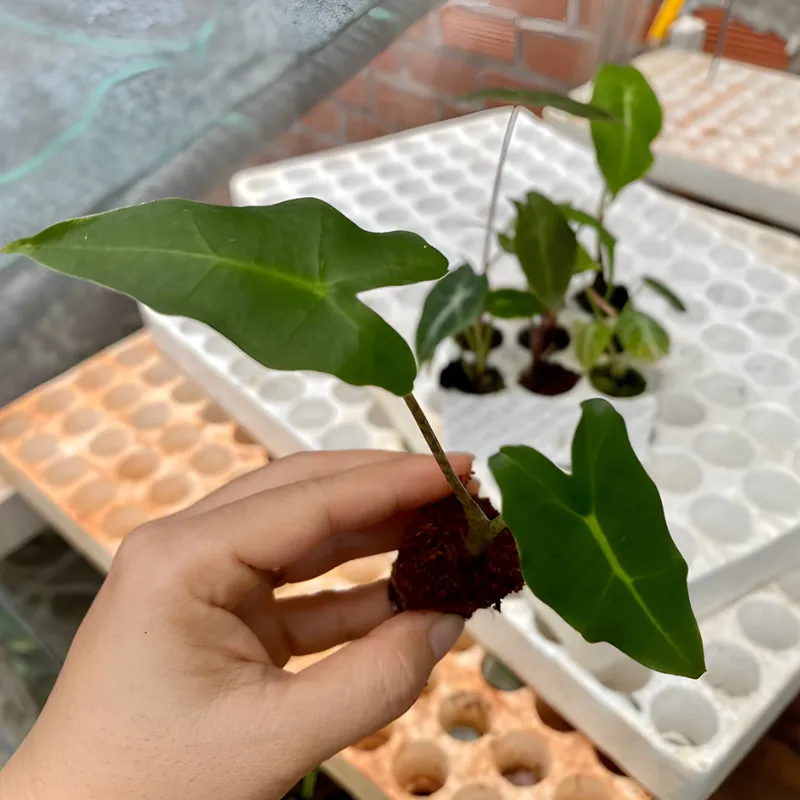Ở giai đoạn đầu, chăm sóc Alocasia Sarian giai đoạn cây con cần nhẹ tay và giữ ẩm tốt. Alocasia Sarian Cấy Mô mới ra chai nên trồng bằng dớn hoặc giá thể mịn, đặt nơi râm mát, ánh sáng yếu. Chưa cần bón phân, chỉ tưới phun sương nhẹ để cây ổn định rễ và quen môi trường.