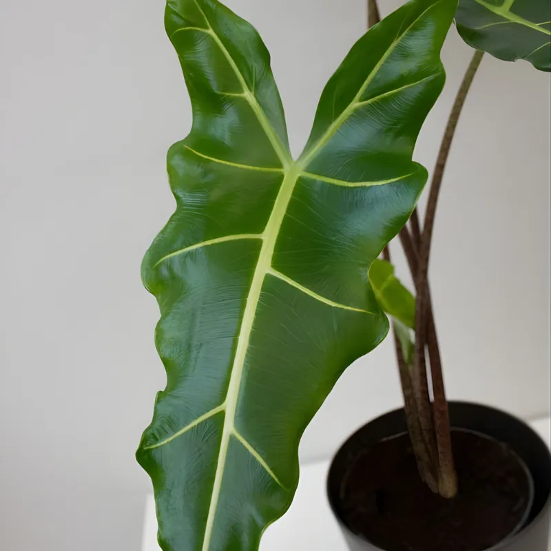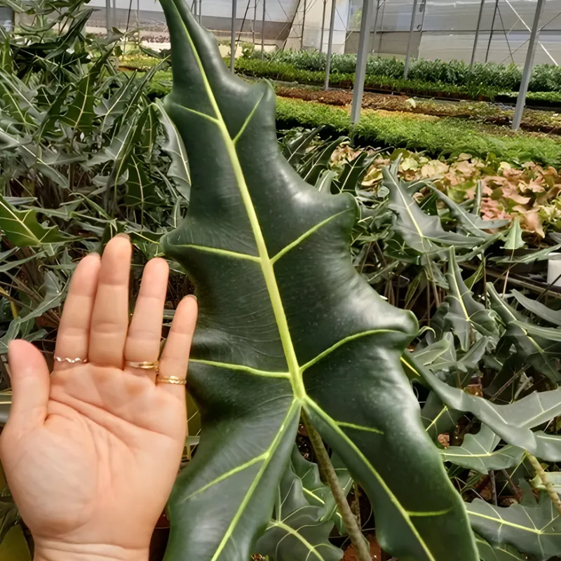 Nhắc đến đặc điểm cây Alocasia Sarian, không thể bỏ qua bộ lá lớn đầy cuốn hút. Đặc điểm lá Alocasia Sarian là phiến lá dài, bản rộng, xanh đậm, bề mặt khỏe, kết hợp lá lớn gân nổi Alocasia Sarian chạy dọc từ cuống đến ngọn, tạo hình xương lá rõ nét như những đường tia sét. Thân cây Alocasia Sarian thực chất là cuống lá cứng cáp, vươn cao thẳng, điểm xuyết các vằn sọc đặc trưng, góp phần tạo nên hình thái Alocasia Sarian vừa hiện đại, vừa mang nét hoang dã rất riêng.